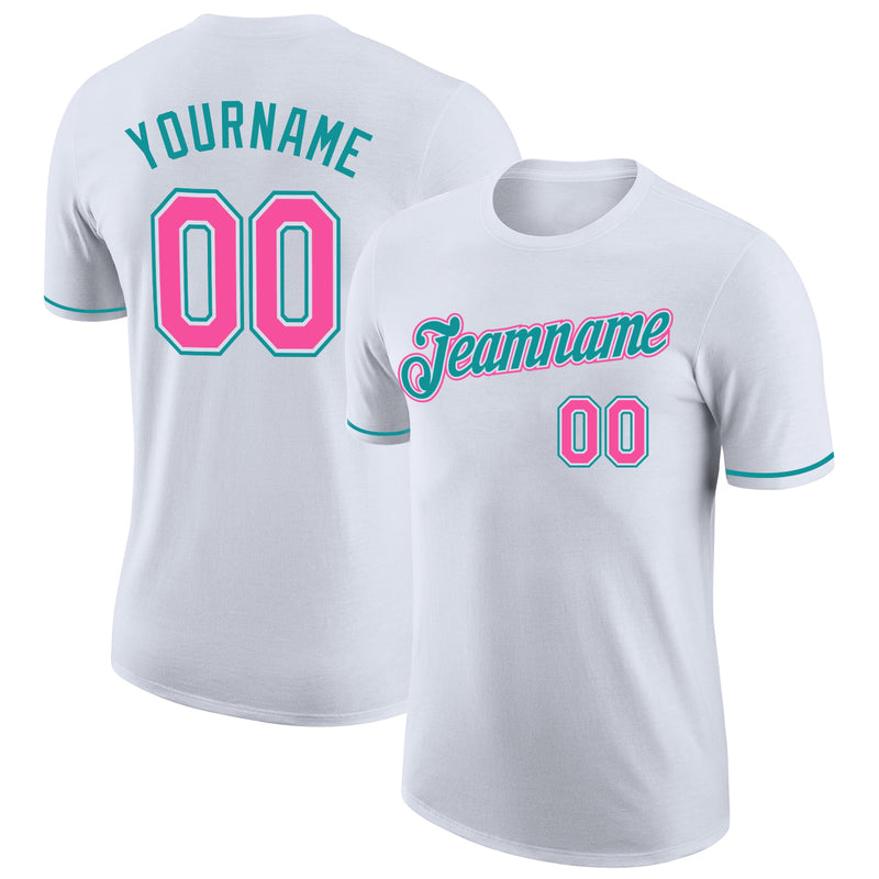 Custom White Pink-Teal Performance T-Shirt